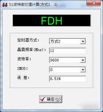 51單片機波特率設置初值計算工具,用于51單片機片內UART異步串行通信各種定時器方式下波特率的設置。 使用方法:選擇定時器方式,晶振頻率,波特率和SMOD計算波特率初值以及顯示出此值與實際的誤差 &
