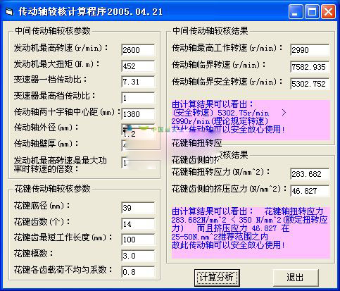 用于軸校核的小軟件,給出中間傳動軸校核參數、花鍵傳動軸校核參數,可以得出中間傳動軸和花鍵傳動軸的校核結果,進而判斷軸是否安全。 輸入基本參數,即可校核傳動軸基本強度,通過程序化剪掉計算!非常好用的!