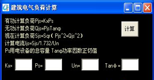 建筑電氣負荷計算小軟件,填入相關數據即可進行自動計算 有功計算負荷Pjs=KxPs 無功計算負荷Qjs=PjsTanφ 視在計算負荷Sjs=Sqr(Pjs^2+Qjs^2) 計算電流Ijs=S