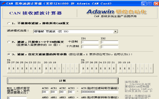 CAN 接收濾波計算器(支持SJA1000 和Adawin CAN Card) 適用范圍: 1.SIA1000及與其兼容的CANr2制器 2.Adewin CANtest軟件及系列CAN卡 用法:無需