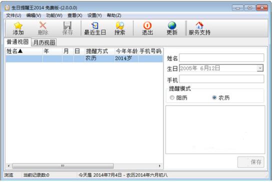 生日提醒王一個非常簡潔易用的提醒器或者說是一個員工生日提醒軟件。支持陽歷(公歷)、陰歷(農歷)生日提前提醒。 功能介紹 1.每次僅在開機時候進行檢測一次(幾乎不影響計算機開機速度)。 2.亦可