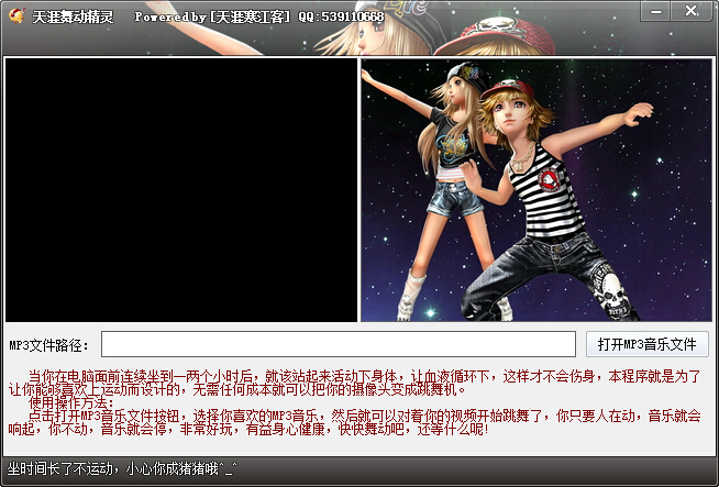 你在電腦面前連續坐到一兩個小時后,就該站起來活動下身體,讓血液循環下,這樣才不會傷身,本程序就是為了讓你能夠喜歡上運動而設計的,無需任何成本就可以把你的攝像頭變成跳舞機。 使用方法