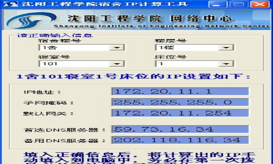 沈陽工程學院宿舍IP計算工具。 第一次使用校園上網軟件進行連接的過程非常重要,學校服務器會將用戶第一次連接時使用的電腦與用戶名進行綁定!請用戶確認使用的是自己的電腦,并已填入了正確的IP! 使用方法