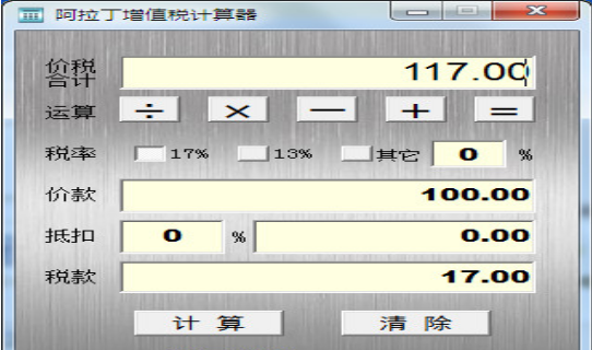 阿拉丁增值稅計算器可快速簡單計算增值稅,也可作普通計算器使用。 能按我國新稅法迅速準確的計算并顯示企業增值稅,利于征稅納稅和企業管理等優點。