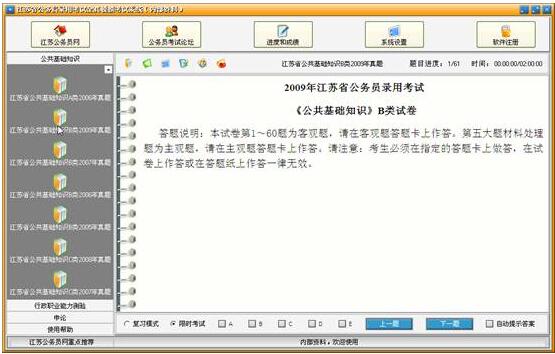 江蘇省公務員錄用考試全真模擬考試系統是一款專門面向江蘇公務員考試及事業單位考試的公務員考試模擬考場系統,其內容包括江蘇歷年的行測真題、申論真題、公共基礎知識真題。是江蘇考生參加公務員考試及事業單位