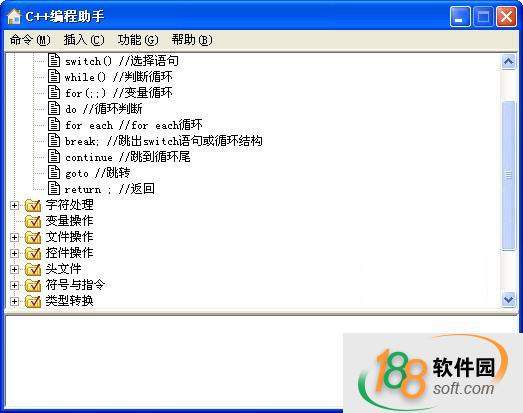 C++編程助手將一些常用或不常用的編程命令等添加到了列表中,方便用戶使用,對于那些英文不怎么好的人是一種極大的幫助。 功能介紹 1.常用命令 2.流程控制 3.變量操作 4.文件操作 5.