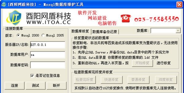 Mssql數據庫維護工具主要功能如下: 1、目前測試支持Mssql 2000 、Mssql 2005、Mssql 2008。 2、修復置疑狀態的數據庫 3、備份數據庫到指定位置 4、恢復