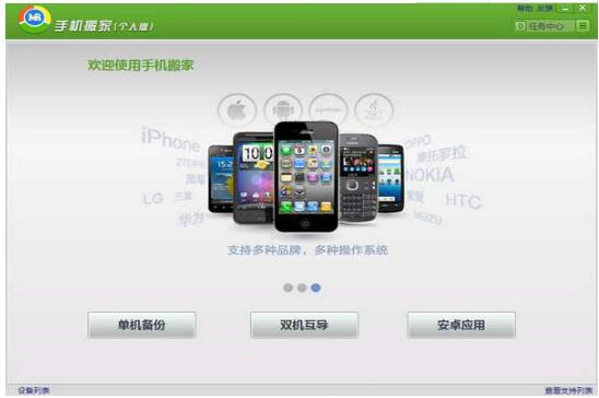 手機搬家(個人版)手機搬家是一款手機數據備份與轉移的PC軟件。使用不限手機品牌和型號,支持手機數據跨品牌,支持手機超過1000款:諾基亞、apple 、三星、 摩托羅拉、 htc、中興、華為、酷派、聯