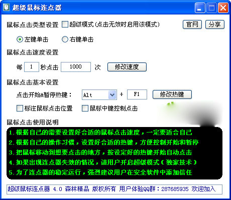 超級(jí)鼠標(biāo)連點(diǎn)器是一款采取獨(dú)特的內(nèi)核技術(shù),能突破所有游戲和軟件對(duì)鼠標(biāo)點(diǎn)擊的屏蔽 有效作用于CF游戲、網(wǎng)絡(luò)聊天室、夢(mèng)三國(guó)、和各種頁(yè)游,讓用戶玩游戲方便快捷。 使用說(shuō)明 1.根據(jù)自己