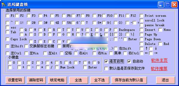 本程序為電腦鍵盤按鍵鎖定工具。用戶可以有選擇地鎖定或解鎖電腦鍵盤上的某些按鍵。 操作方法: 運行程序后,點擊程序窗口中的某個鍵盤按鍵圖標或“鎖定所有按鍵(解鎖)”按鈕可對相