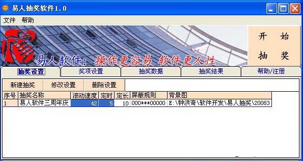 《易人抽獎軟件》企事業單位進行市場活動中抽獎用的計算機自動抽獎工作。 易人抽獎軟件可以批量導入數據。并可以設置抽獎號碼顯示部分,如手機中間段可屏弊。 抽獎底圖可更改,抽獎框及抽獎結果框