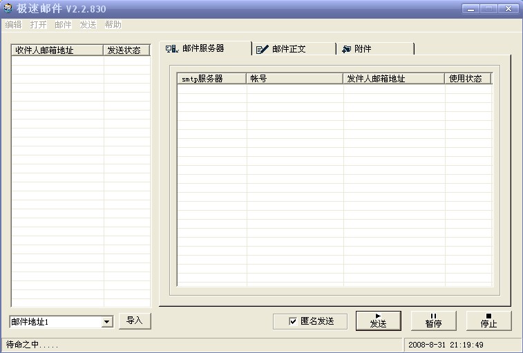 特點(diǎn):1、本程序完全免費(fèi),沒有任何功能限制2、支持SMTP用戶密碼認(rèn)證3、支持附件4、支持1-100線程并發(fā)!極大的提高發(fā)...