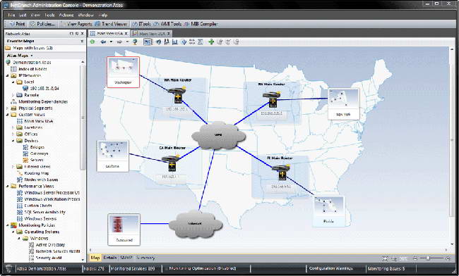 自動探測和呈現圖形化網絡布局圖,反映設備和主機的最新狀態。可以定義報警并通過電話、尋呼機、電子郵件或ICQ等途徑發出報警。包含方便的IP包工具:圖形化ping、traceroute、帶寬利用和端口掃描