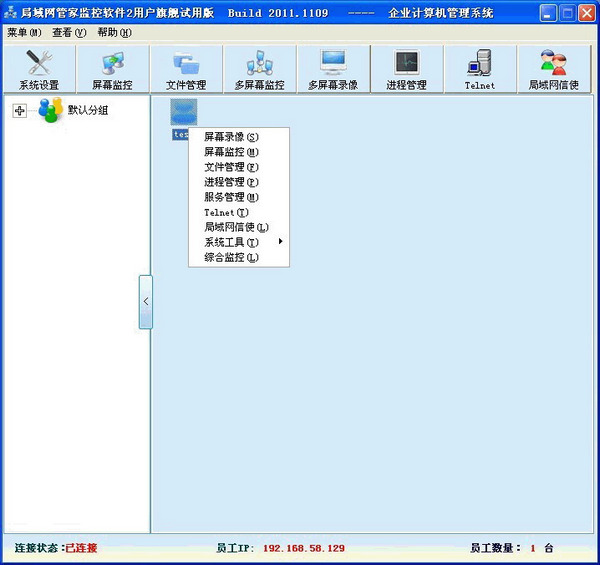 局域網(wǎng)管家是一款局域網(wǎng)監(jiān)控軟件,是公司對員工、家長對孩子、老師對學(xué)生進(jìn)行管理的最佳首選軟件。 功能特色 局域網(wǎng)管家可實時對員工電腦進(jìn)行屏幕監(jiān)控,并可以電視墻形式同時多臺員工電腦屏幕監(jiān)控,控員工