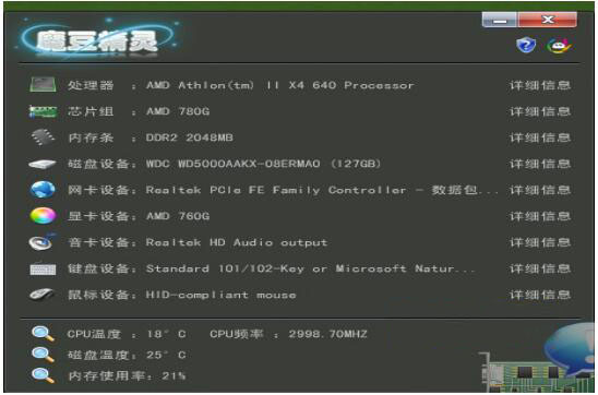 魔豆精靈硬件檢測為您檢測您愛機(jī)的硬件屬性,包括CPU,主板,BIOS,磁盤,內(nèi)存,顯卡,聲卡,網(wǎng)卡,以及鼠標(biāo)鍵盤信息。并且為您實(shí)時(shí)顯示CPU溫度,磁盤溫度以及檢測硬件的健康狀態(tài)。以及硬件驅(qū)動備份。&n