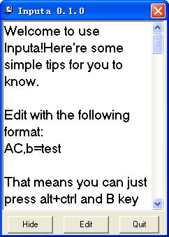 Inputa是一個用于快捷輸入的小軟件。通過設置,你可以使用Ctrl,Alt,Shift與字母等其他按鍵的組合鍵快速輸入文字。 你可以將用戶名、電話號碼等常用信息保存,然后可以方便地用快捷鍵填寫表單中