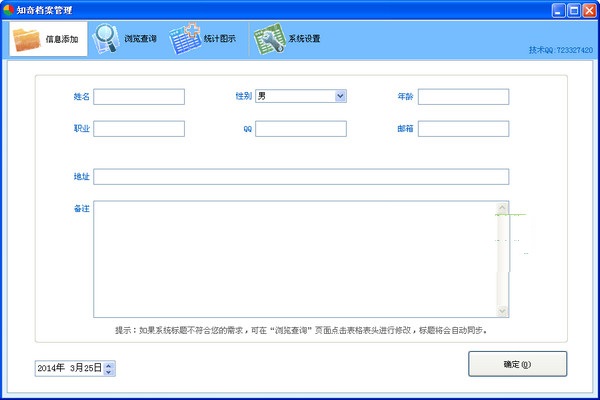 知奇檔案管理軟件是一款用戶、會員、客戶相關信息記錄、提取、查詢的免費小軟件,使用Sqlite數據庫。它可以幫你記錄每個客戶的全面資料,需要時方便調取。還可以按月、年作出總數統計。單擊表頭可以隨意自定義