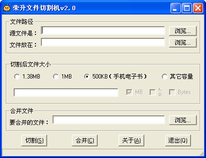榮升文件切割機一款綠色軟件,能非常方便的把一個大文件切割成為許多個小文件,也可以將多個被切割的文件還原成一個大文件。