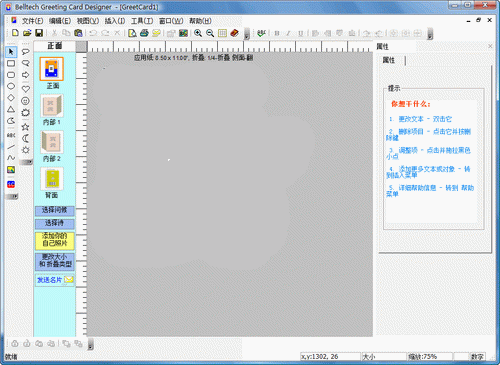 Belltech Greeting Card Designer 是一款賀卡設計工具,可以使用照片、剪貼畫、心形、太陽、月亮、笑臉等各種圖形創作自己的賀卡,并可立即打印出來。支持BMP、JPG、GIF、
