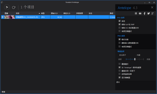 Voralent Antelope是一款批量圖片壓縮工具,能夠在保證圖片質量沒的損失的情況下,壓縮圖片大小的軟件。它支持JPEG 或 PNG圖像的無損壓縮,并且使用簡單,一鍵完成。 軟件特色 能在