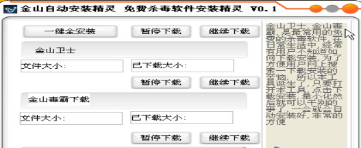 金山自動安裝精靈提供金山衛士、金山毒霸、獵豹瀏覽器等產品一鍵全安裝是一款關于金山產品的一鍵自動安裝器,可以自動下載和安裝,非常的方便,軟件運行之后,即會最小化,不妨礙你干些別的事情。
